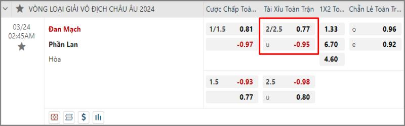 Giả sử trận đấu giữa Đan Mạch vs Phần Lan được nhà cái BK8 đưa ra tỷ lệ O/U 2.25 với: